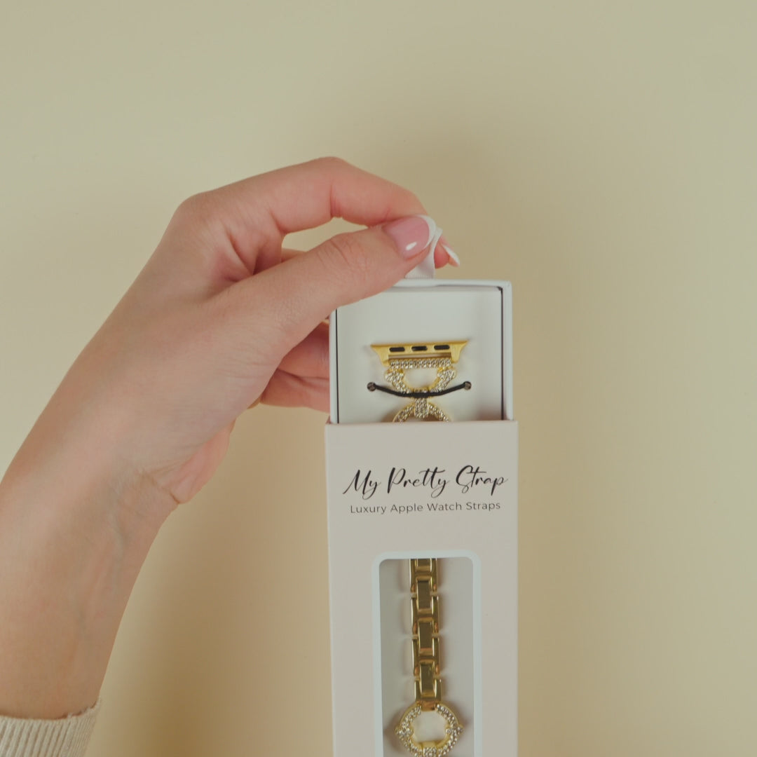 Crafted from premium stainless steel with oval-shaped chains, over 1000 rhinestones sparkle in this watch strap! It elevates your Apple Watch with its luxurious look & feel. Each watch strap was designed to fit your Apple Watch seamlessly straight from the box.