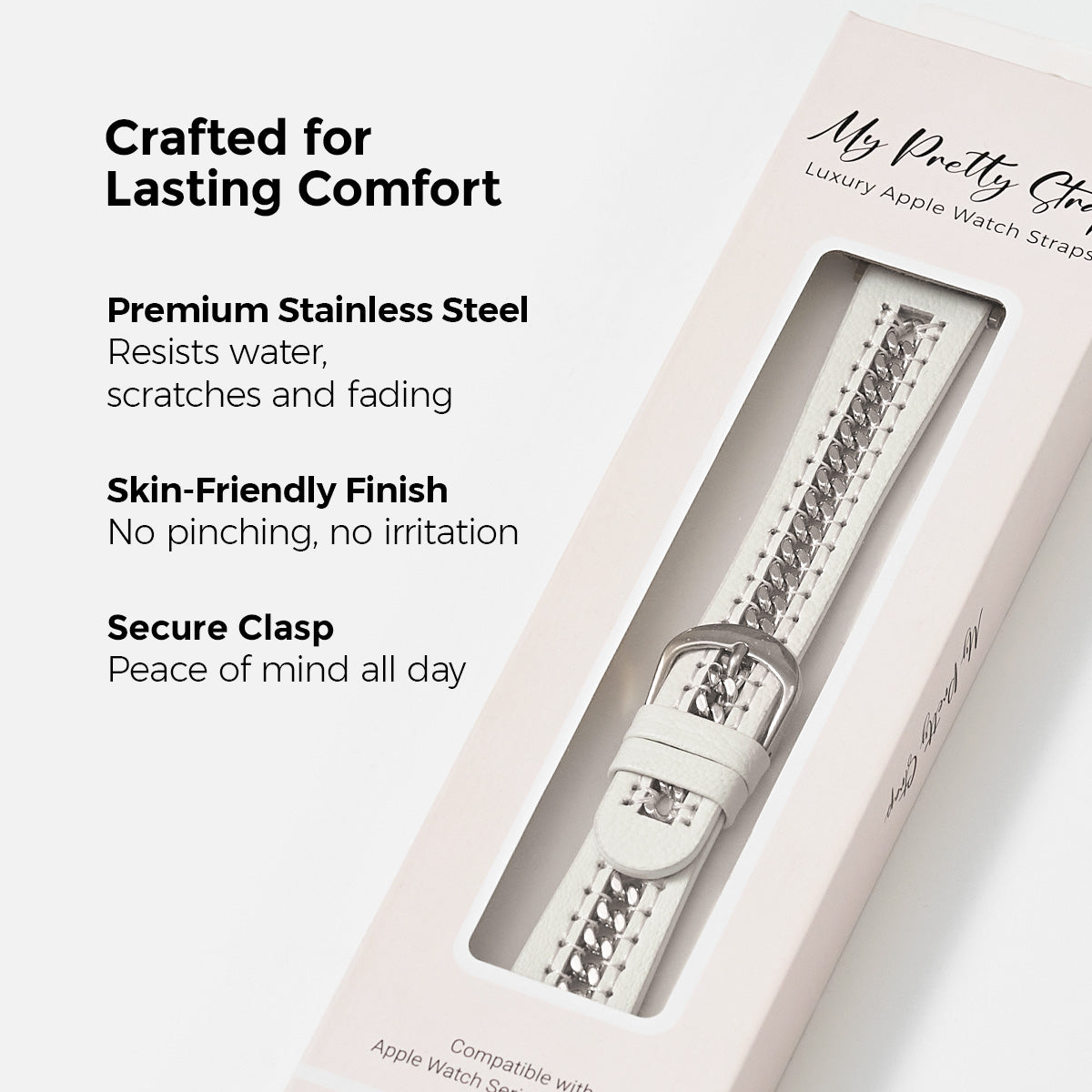 Crafted from premium stainless steel and twisted into elegant woven link chains, this watch band elevates your Apple Watch with its luxurious look & feel. Each watch band comes with its own metal adapter, designed to fit your Apple Watch seamlessly straight from the box.